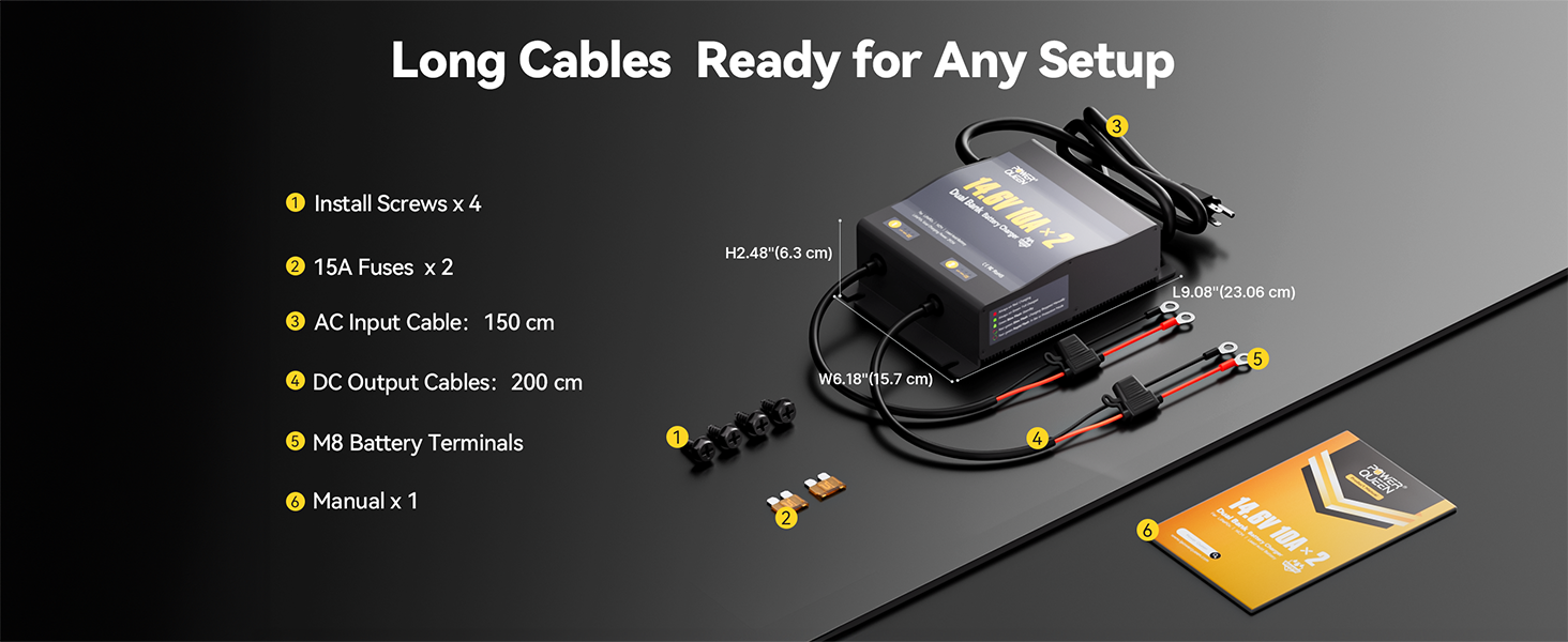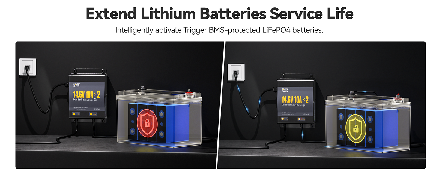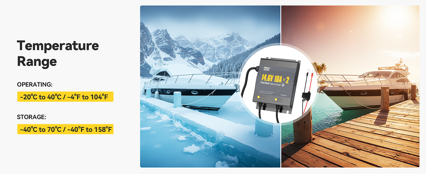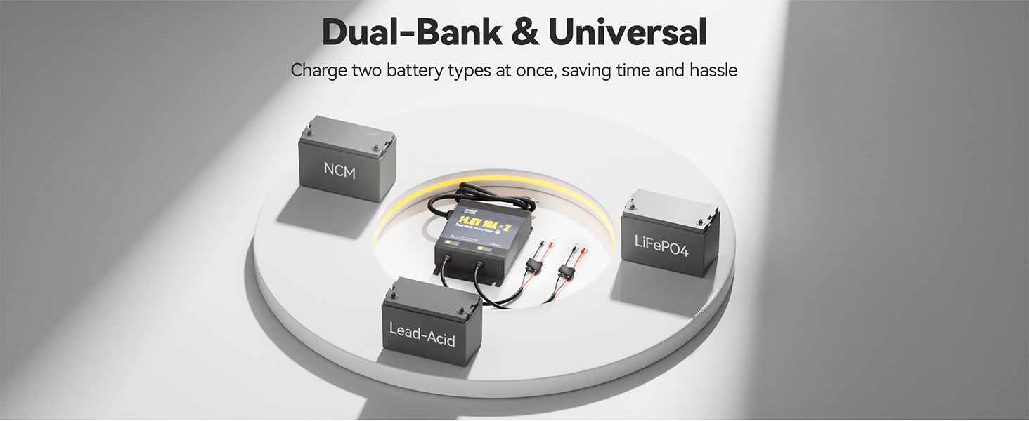 [Dual-Channel Independent Charging & Wide Voltage Input] Power Queen 2-Bank 10A (10A/Bank) Dual Smart Battery Charger, enjoy the ultimate convenience of charging two batteries simultaneously without any interference. With a wide voltage input range, this charger is your reliable power partner anywhere. Each channel delivers a stable 10A output, ensuring fast and efficient charging every time.