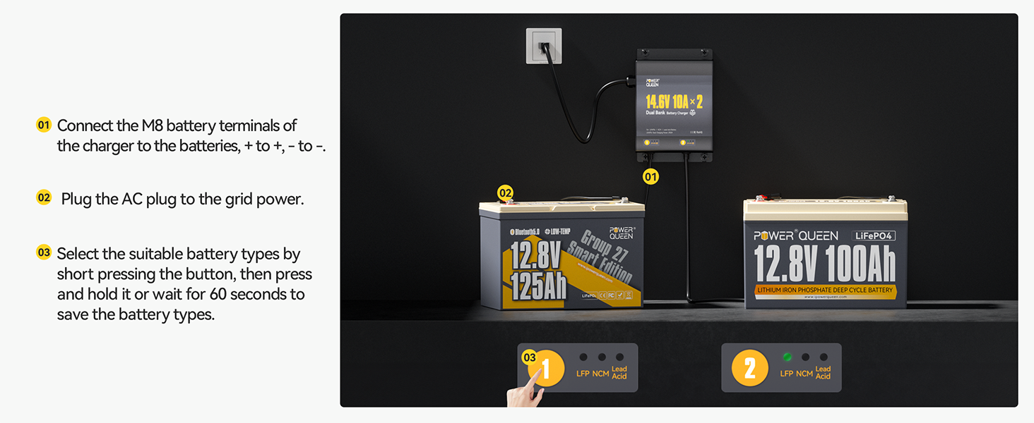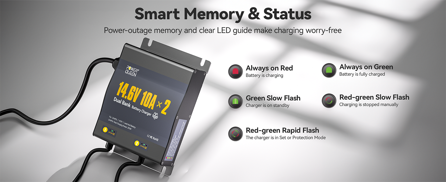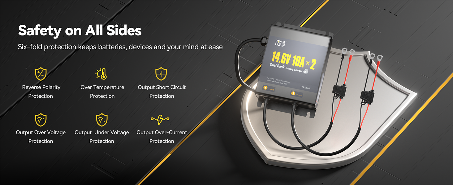 [All-Round Protection & Smart LED Indication] Power Queen 2-Bank 10A (10A/Bank) Dual Smart Battery Charger, built with your safety as the top priority, it features comprehensive protection, including Output Short-Circuit, Reverse Connection, Output Over-Current, Output Over-Voltage, Over-Temperature, and Output Under-Voltage protection. The intuitive LED lights clearly display real-time status: Standby, Charging, Full, Fault, and Battery Type, so you're always in control.